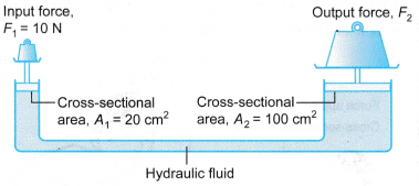 Example 2. Figure shows an activity to demonstrate the hydraulic system as a force multiplier. A small boy uses a force of 8 N to press the piston of the small syringe with a cross-sectional area of 1.6 cm2. His elder brother presses the piston of the large syringe with a cross-sectional area of 64 cm2.