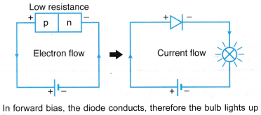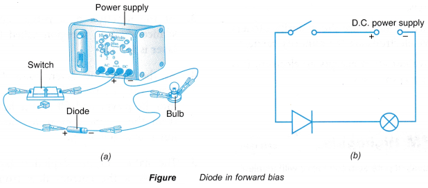 - In forward bias, the p-type (anode) of the diode is connected to the positive terminal and the n-type (cathode) is connected to the negative terminal of a battery as shown in Figure.
