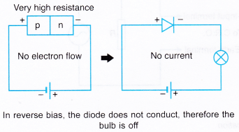 - In reverse bias, the n-type is connected to the positive terminal and the p-type is connected to the negative terminal of the battery as shown in Figure.