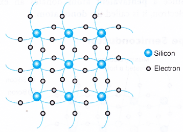 - Figure shows the outer electrons in a silicon crystal. All the electrons are involved in perfect covalent bonds, leaving no free electrons to conduct electricity.