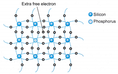 - If atoms with five valence electrons (pentavalent atoms), such as phosphorus (P), arsenic (As), or antimony (Sb), are doped into the intrinsic semiconductor to replace some of the silicon atoms, then each of the pentavalent atoms will have four covalent bonds and one extra electron. These pentavalent atoms produce the n-type semiconductor by contributing extra electrons.