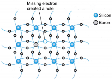- In the case of silicon, if atoms with three Valence electrons (trivalent atoms) such as boron, aluminium, indium or gallium are doped into the intrinsic semiconductor to replace some of the silicon atoms, then the result is that one electron is missing from one of the four covalent bonds. These trivalent atoms produce the p-type semiconductor by creating deficiencies of valence electrons called holes.