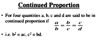 Example: If 2 : 4 : : 4 : 8, then we say that 2, 4, 8 are in continued proportion.