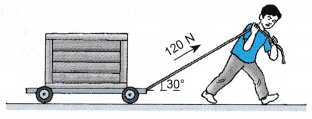 Example 13. A boy uses a force of 120 N to pull a crate along a straight corridor. The applied force is at an angle of 30° with the horizontal floor.