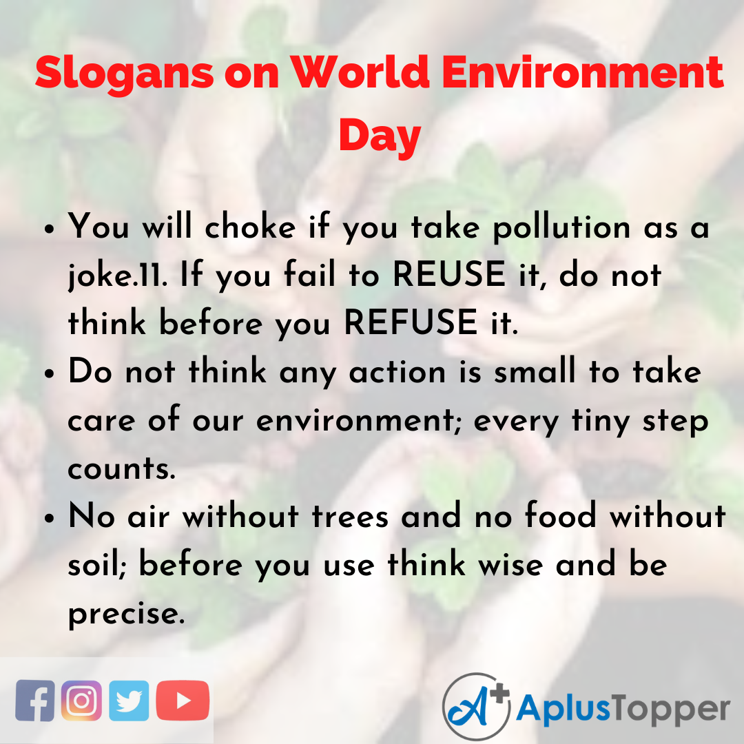 As slogans help attract the target audience, it is essential that a prestigious day, like World Environment Day, can reach out to a significant part of the population and bring them under the same umbrella. Awareness can be broadcasted to the public regarding the importance of protecting the environment with catchy slogans.