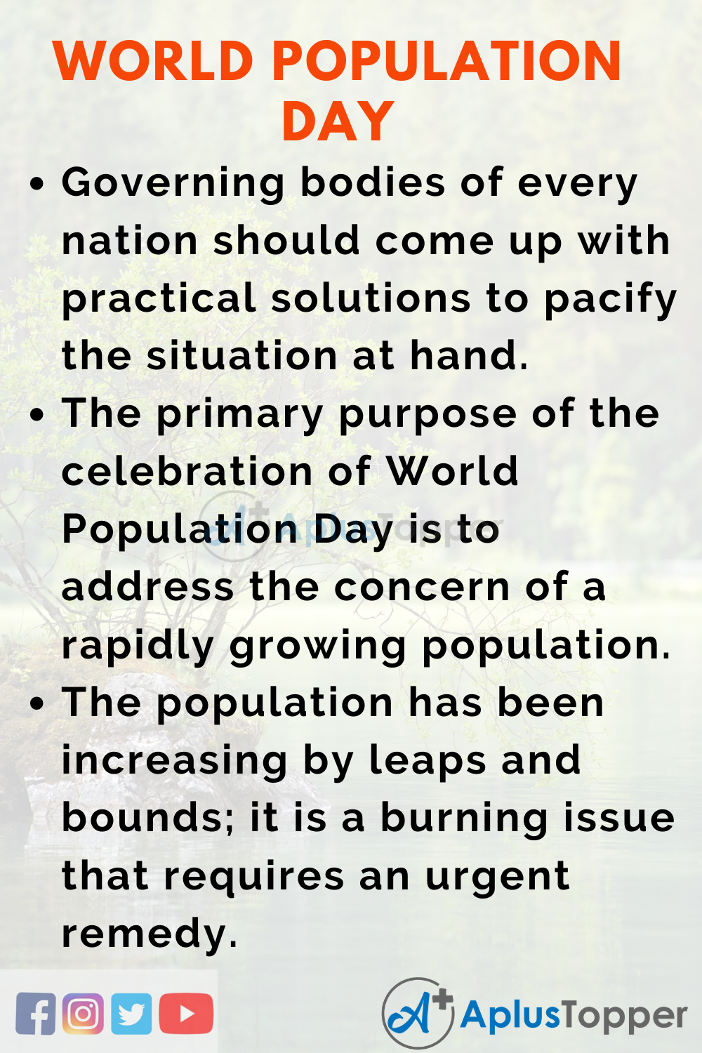 - The primary purpose of the celebration of World Population Day is to address the concern of a rapidly growing population.