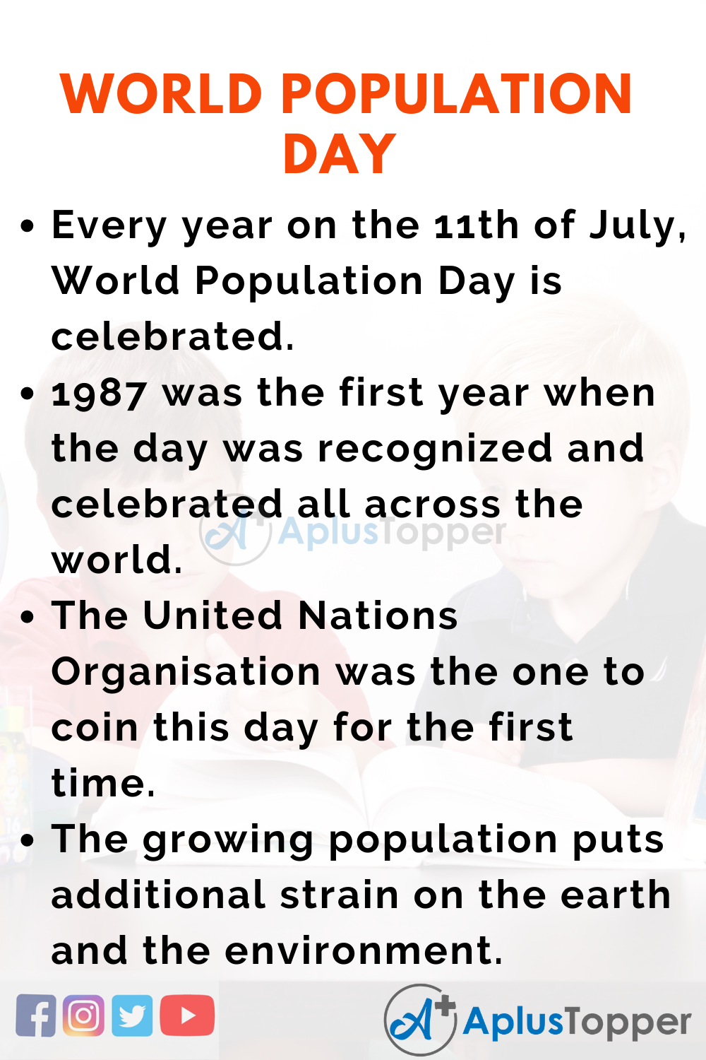 World Population Day Essay: The Eleventh of July is regarded as the World Population Day, all across the globe. This day was marked as celebratory since 1987 by the United Nations organization. The main goal of World Population Day is to raise awareness among the people concerning the world’s growing population.