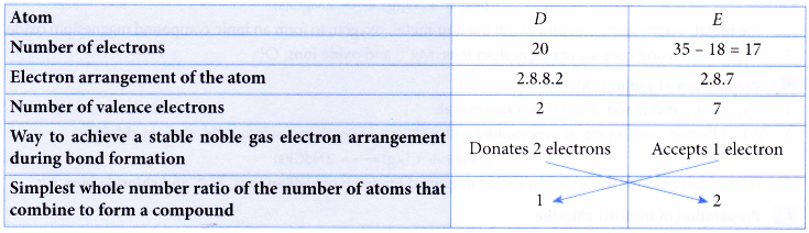 1. An atom of element D has 20 electrons. An atom of element E has 18 neutrons and a nucleon number of 35. Deduce the formula of the compound formed between elements D and E.